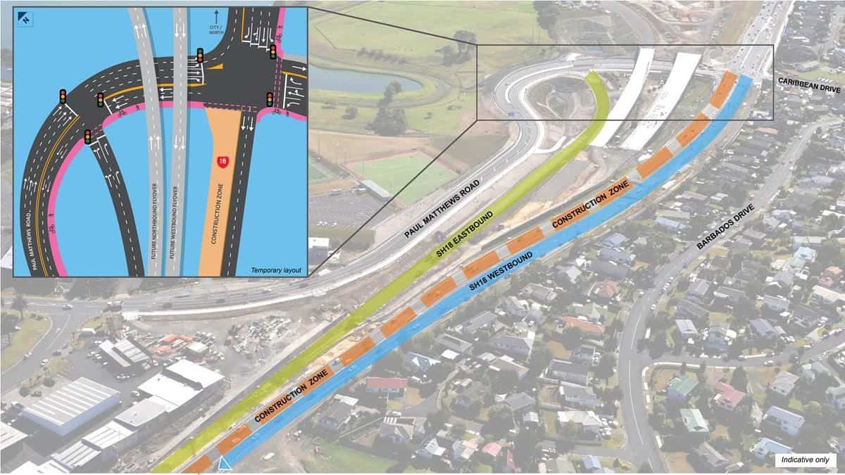 North Shore drivers are advised to get ready for big changes to how they travel on SH18 when a new eastbound off-ramp opens after Anzac weekend. This will shift all traffic heading east through a new intersection at Paul Matthews Road from Tuesday 27 April.